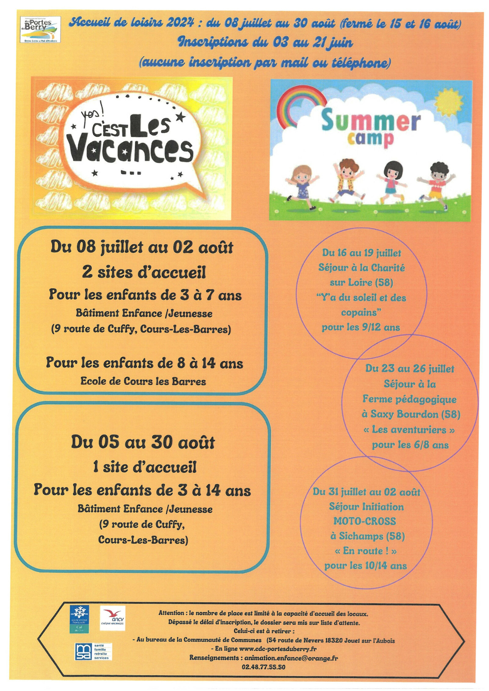 INSCRIPTIONS VACANCES DE PRINTEMPS 2024 DOCUMENTS A TELECHARGER ICI ⇓ DOSSIER MERCREDIS 2023/2024Contacter les bureaux de la Communauté de communes au 02 48 77 55 50 |